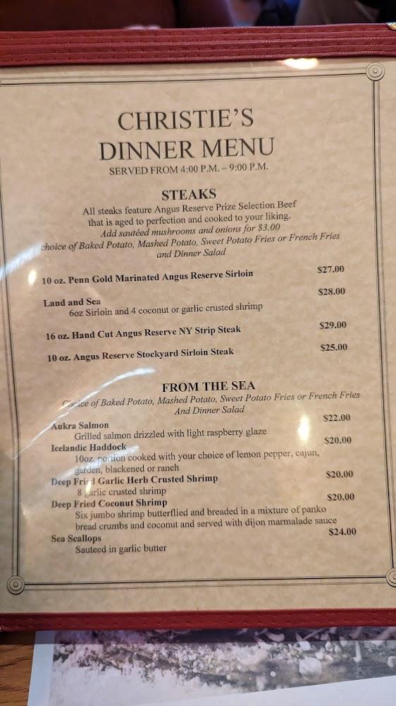 Sides like hand-cut fries and onion rings elevate the meals further. Dessert options complete the dining experience, though they could use more variety. With over 50 dishes on the menu, Christie's ensures that every guest finds something they love, whether for lunch or dinner.